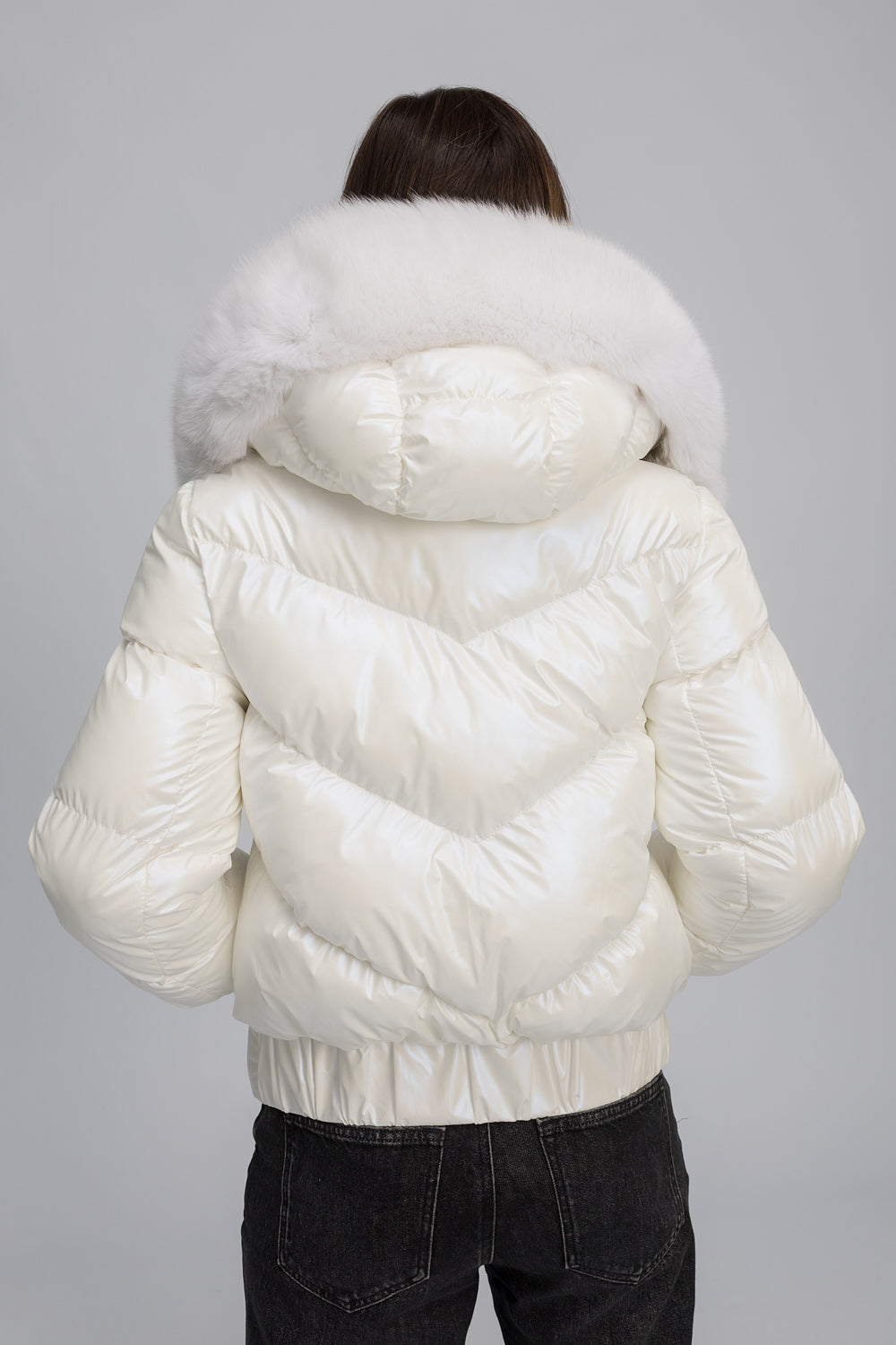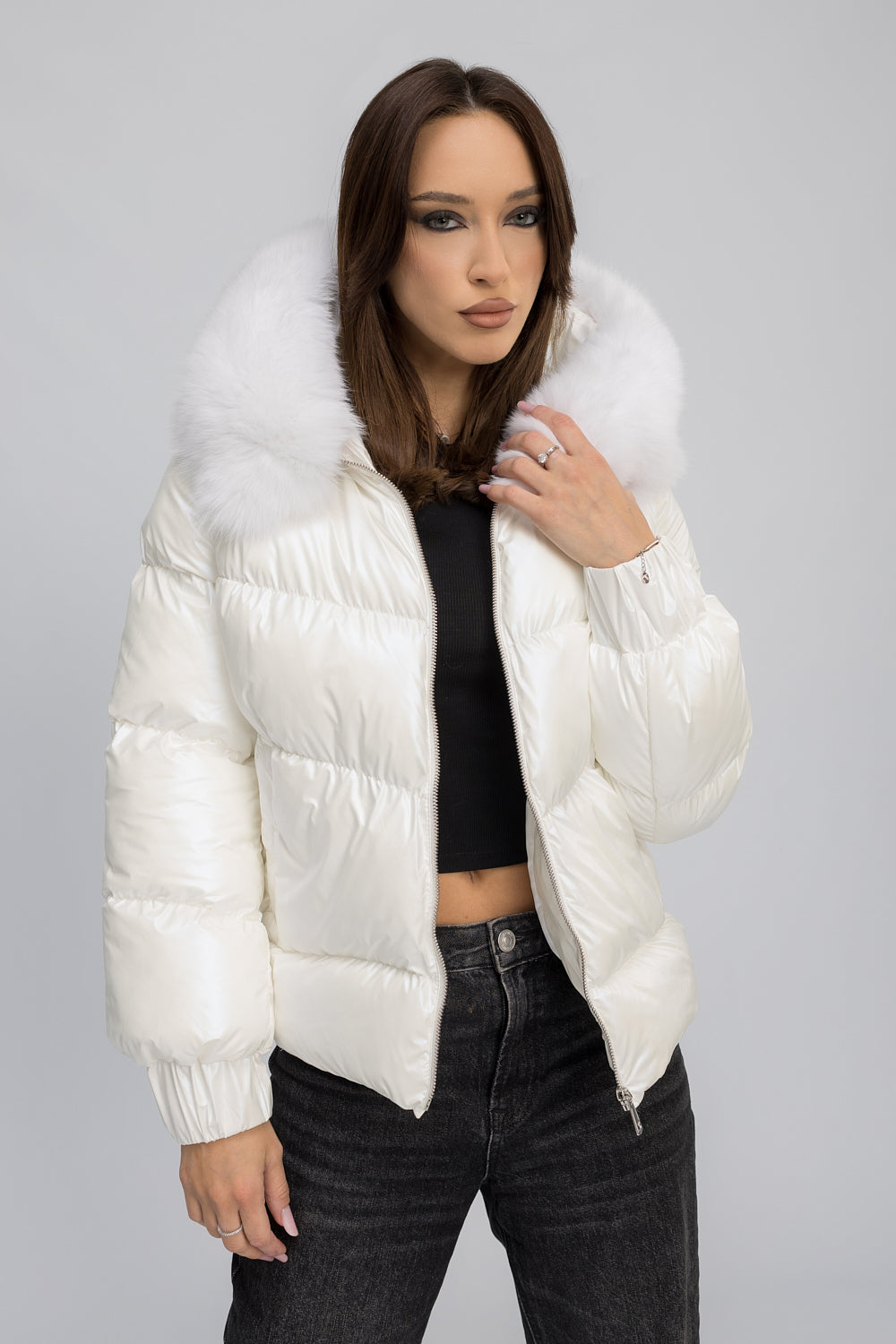 Geacă Bomber cu Guler din Blană Naturală de Vulpe, Femei, Arctic White 461