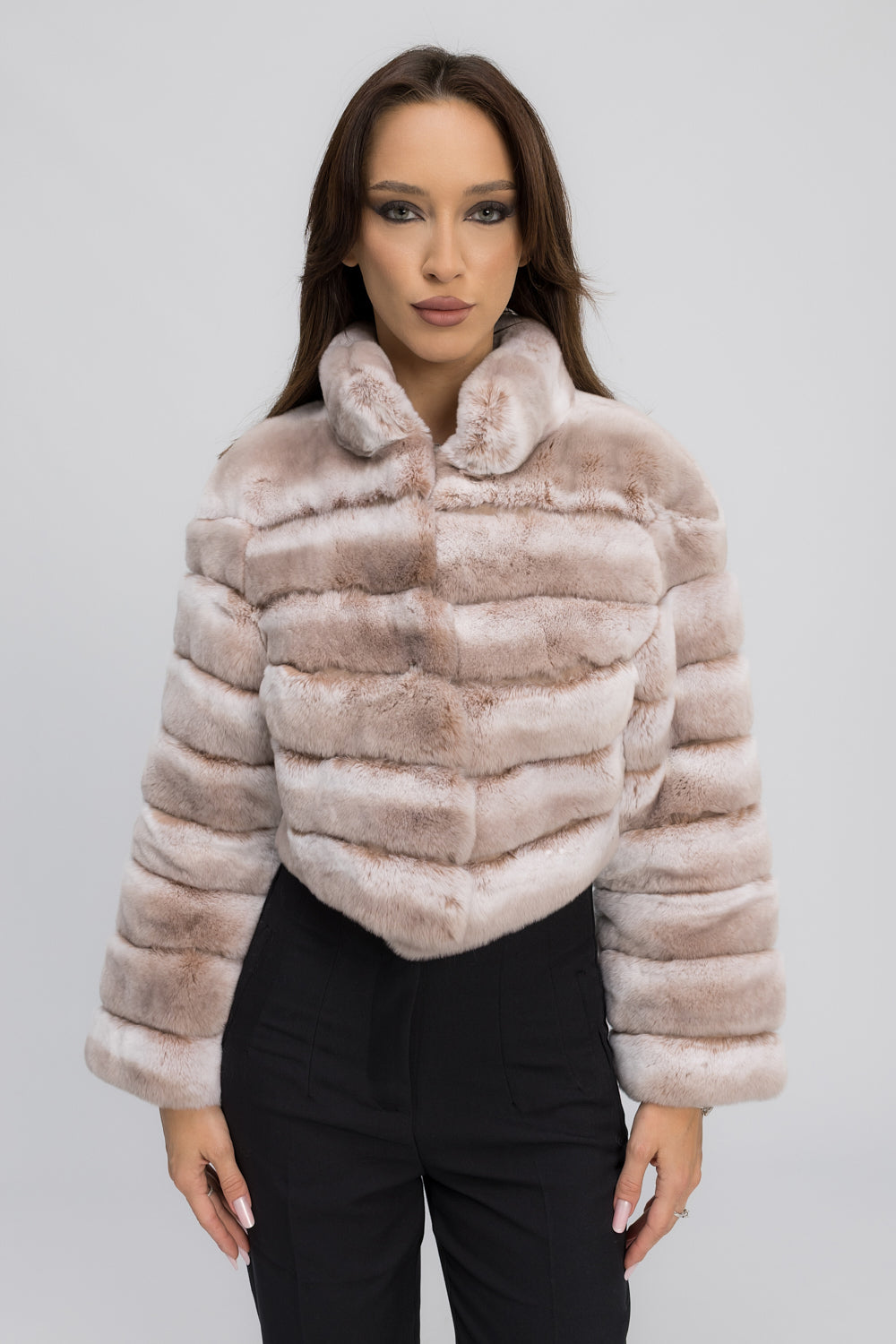 Haină din Blană Naturală de Rex Chinchilla, cu Guler Tunică, Femei, Cappuccino Mist 464