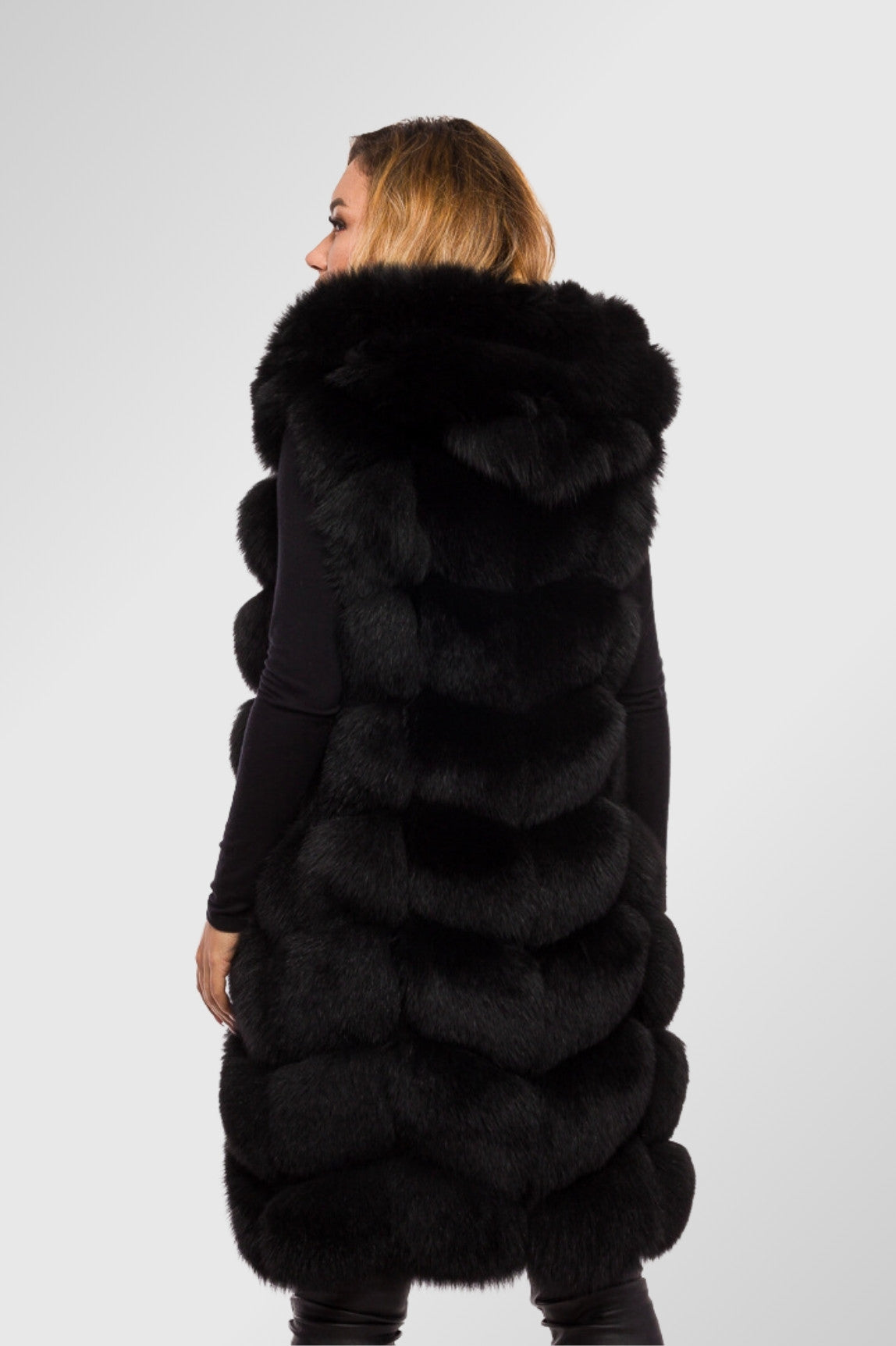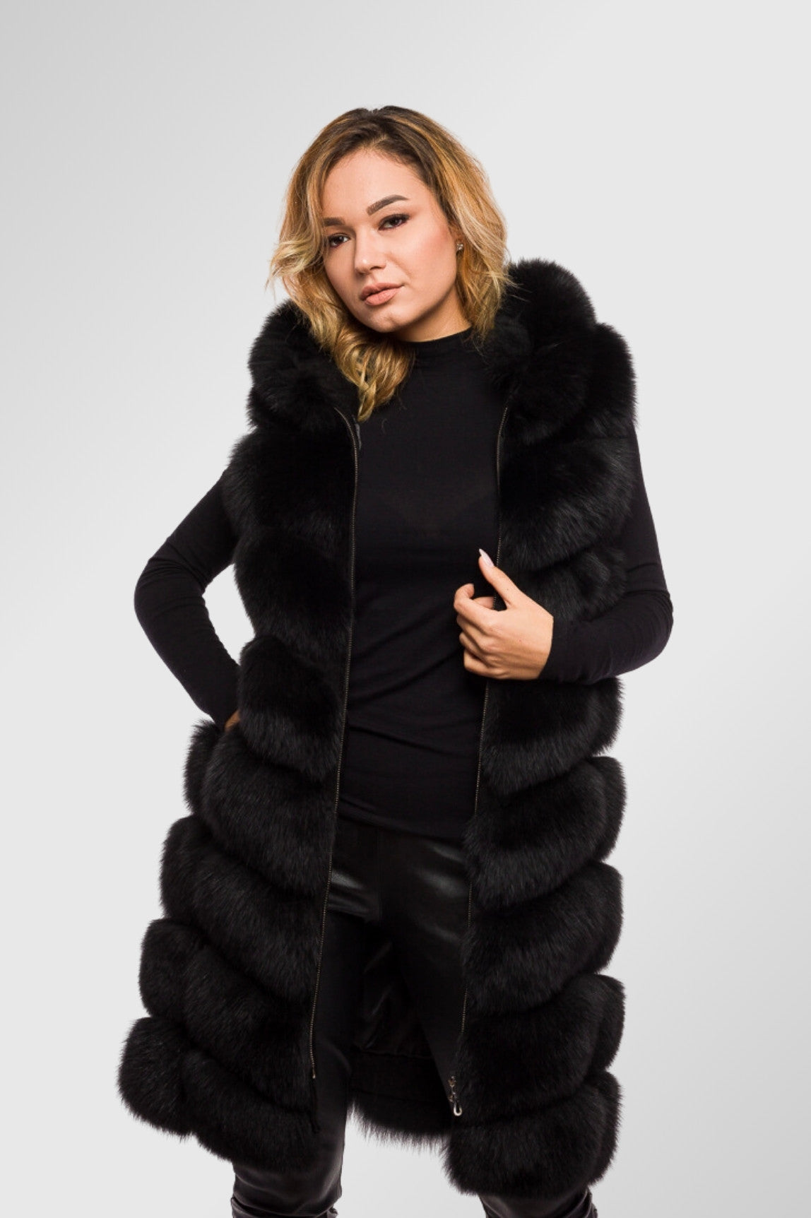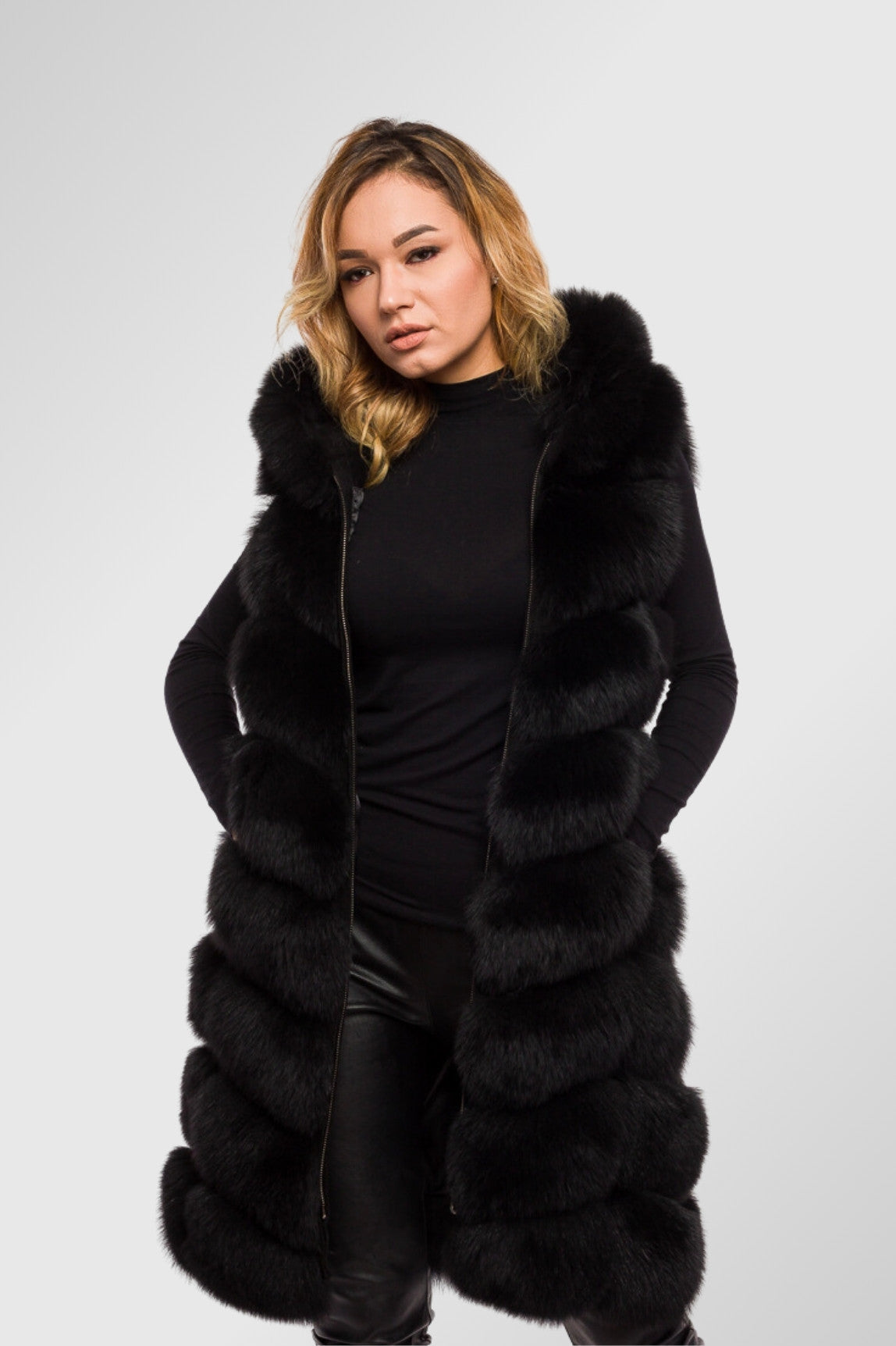 Vestă din Blană Naturală de Vulpe, cu Glugă, Femei, Obsidian 320