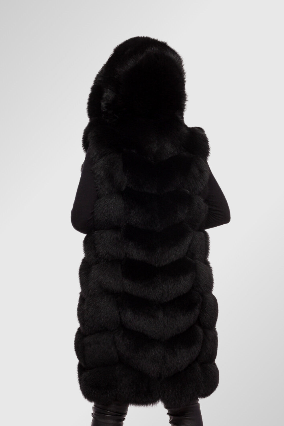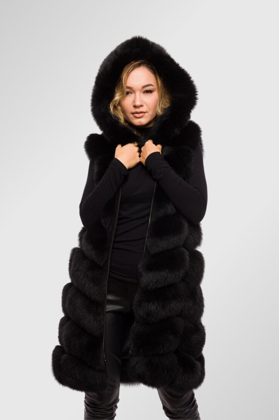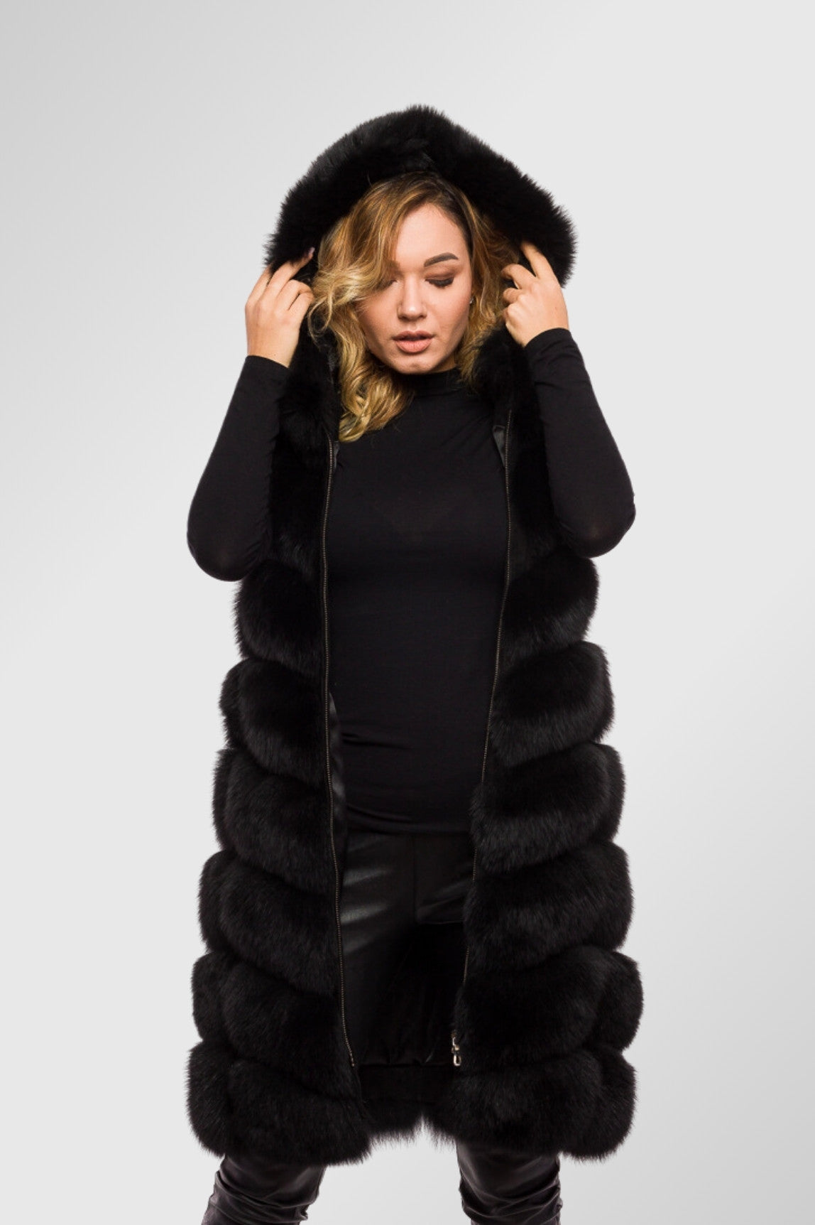 Vestă din Blană Naturală de Vulpe, cu Glugă, Femei, Obsidian 320