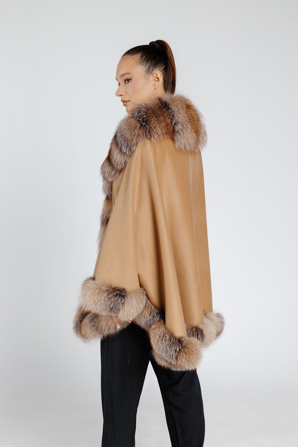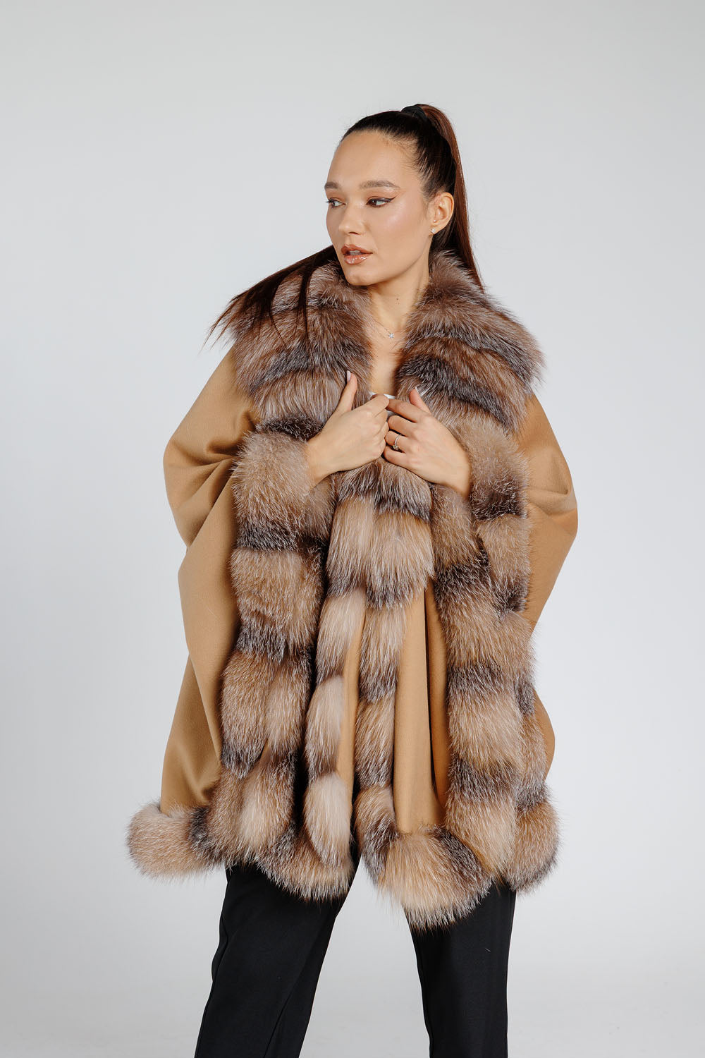 Realizată din cașmir, această capă este moale, ușoară și plăcută la atingere, fiind completată de blana naturală de vulpe, care adaugă un plus de volum și lux. Croiala lejeră și detaliile sofisticate transformă această piesă într-un element esențial al garderobei de sezon rece, potrivită atât pentru ținutele casual, cât și pentru apariții elegante.