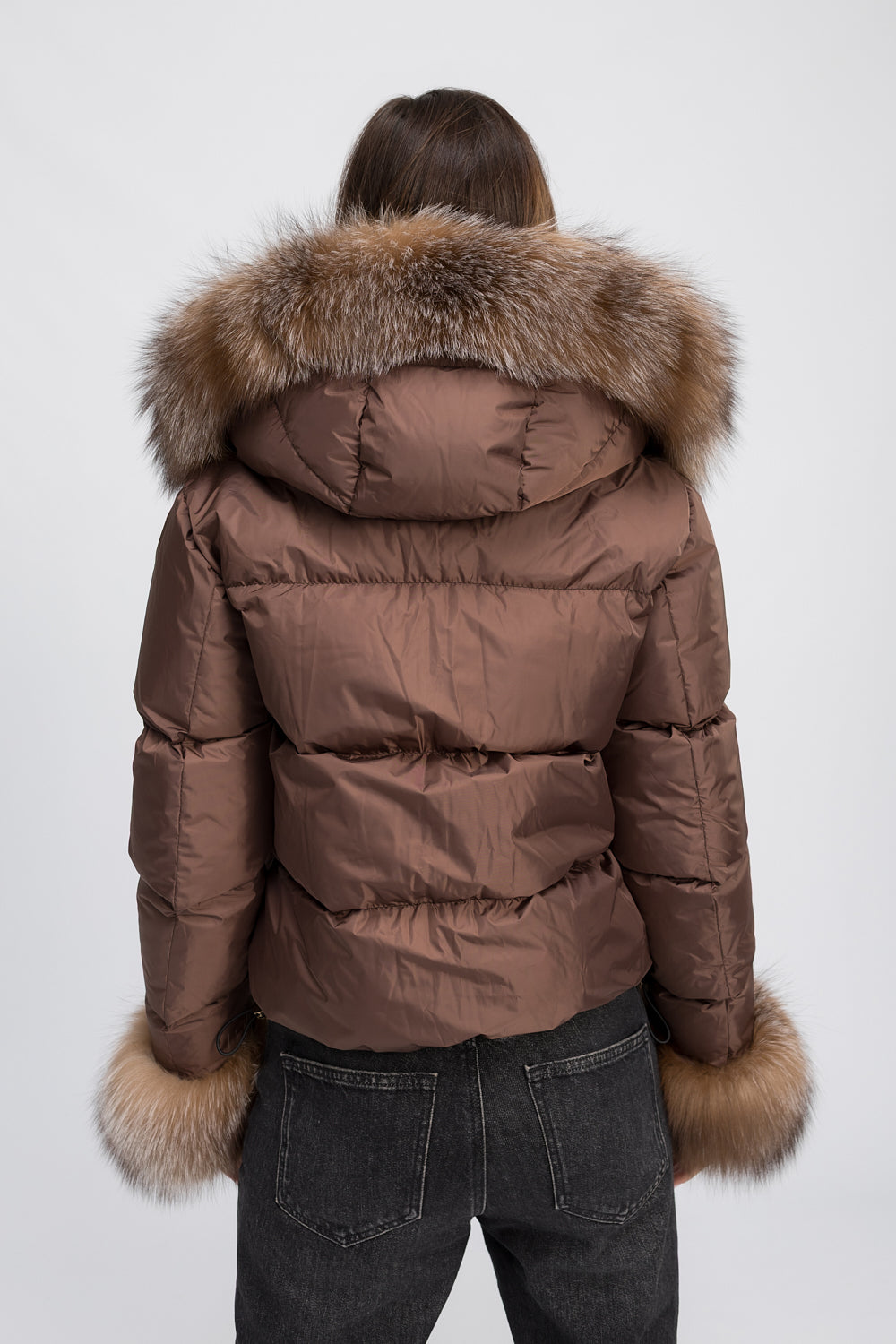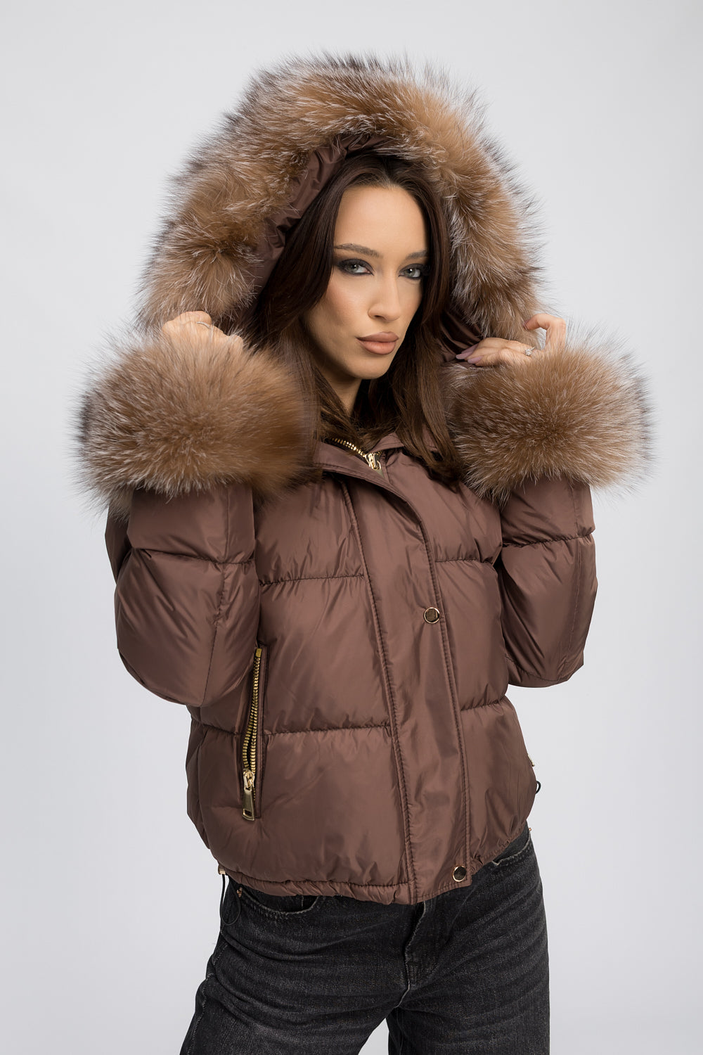 Geacă Scurtă cu Glugă și Manșete din Blană Naturală de Vulpe, Femei, Mocha Glow 459